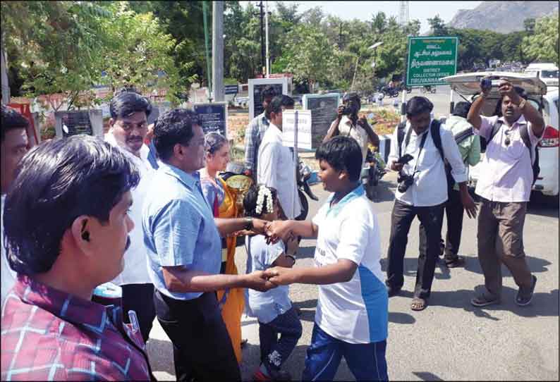 பின்னோக்கி செல்லும் மாணவரின் நடைபயணத்தை கலெக்டர் கந்தசாமி கையை பிடித்து வாழ்த்தி தொடங்கி வைத்தார். கலெக்டர் அலுவலகத்தில் இருந்து திருவண்ணாமலை அருணாசலேஸ்வரர் கோவில் வரை 7 கிலோ மீட்டர் மாணவர் சிவகுரு பின்னோக்கி நடந்து விழிப்புணர்வு பிரசாரம் செய்தார். நிகழ்ச்சியில் முத்தமிழ்கணேசன் உள்பட பலர் கலந்து கொண்டனர்.