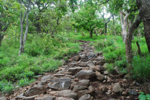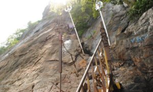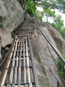 Reaching the top of Parvathamalai is an arduous task. It is a vertical mountain over 4,000 feet in height that has iron rod steps, track steps, ladder steps, and sky steps (Agaya padi) not found at other such sacred mountains. The Kadapaarai Padhai section of the climb up the Hill is considered to be the toughest part of the trek. This part which is punctuated by iron rods drilled into the rocks and chains to assist during the sharp ascent is also only wide enough to accommodate one-way traffic. Thus one has to raise one’s voice from the bottom of this section and wait for acknowledgment from the other end before starting to climb the Kadapaarai Padhai section.